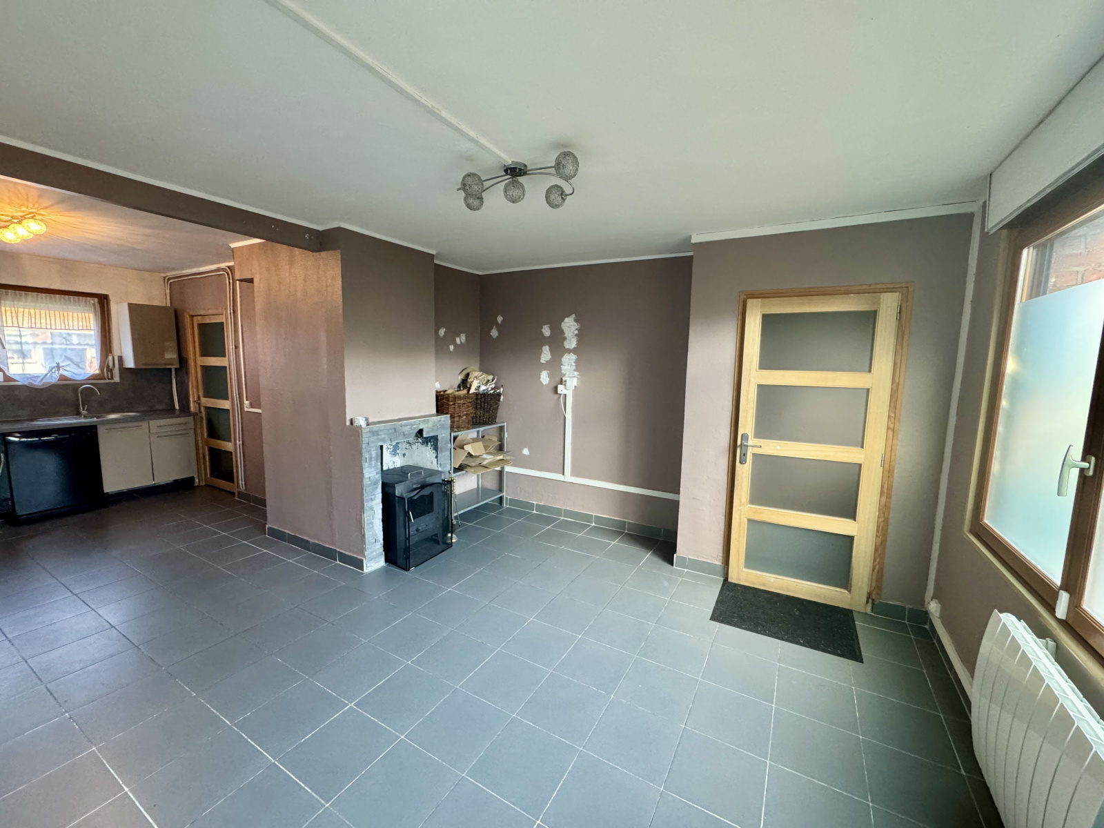 Chauffage électrique, cheminée tubée dans le salon.