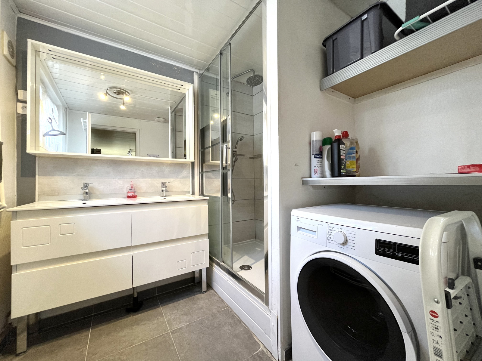 Vous trouverez à l'entrée, un hall, une chambre meublée au RDC de 16m2, un salon, une cuisine équipée comprenant la vaisselles, four, micro-ondes, congélateur, un WC séparé, une salle de bain avec sa vasque, douche et machine à laver.