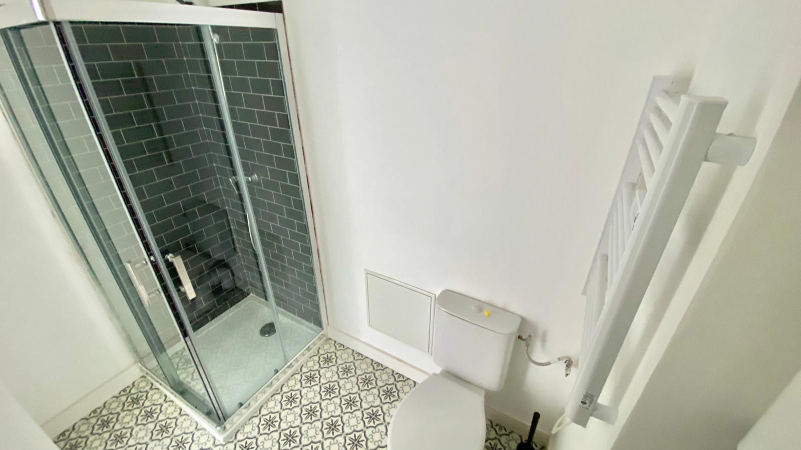 Une salle de bain moderne avec sa douche, son WC, son meuble vasque, miroir LED et sa machine à laver.