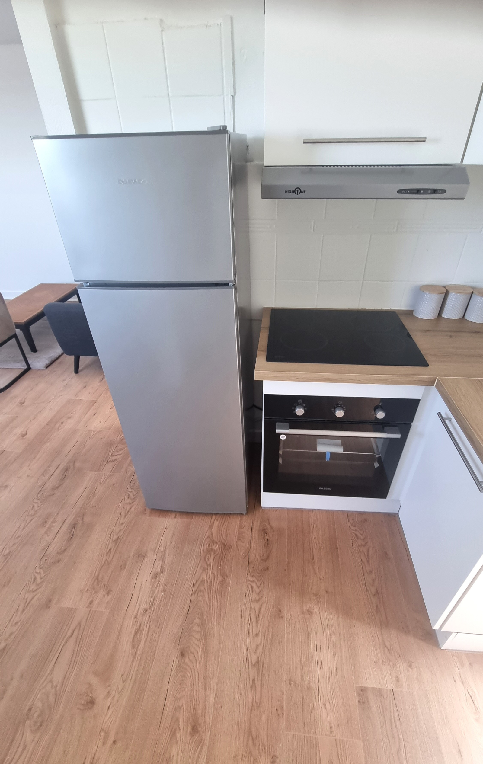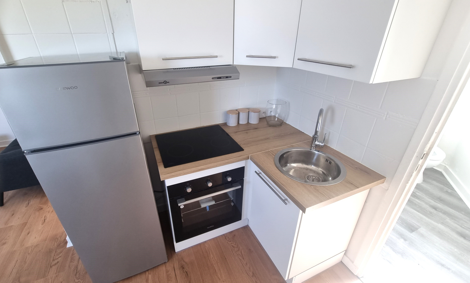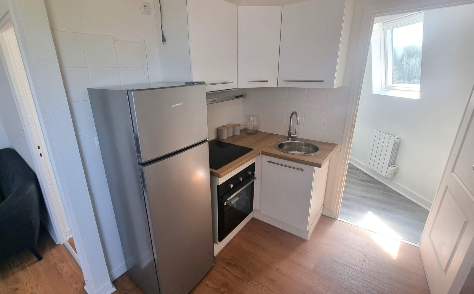Equipement : Plaque de cuisson vitro céramique, four, frigo, et un emplacement pour lave-linge.